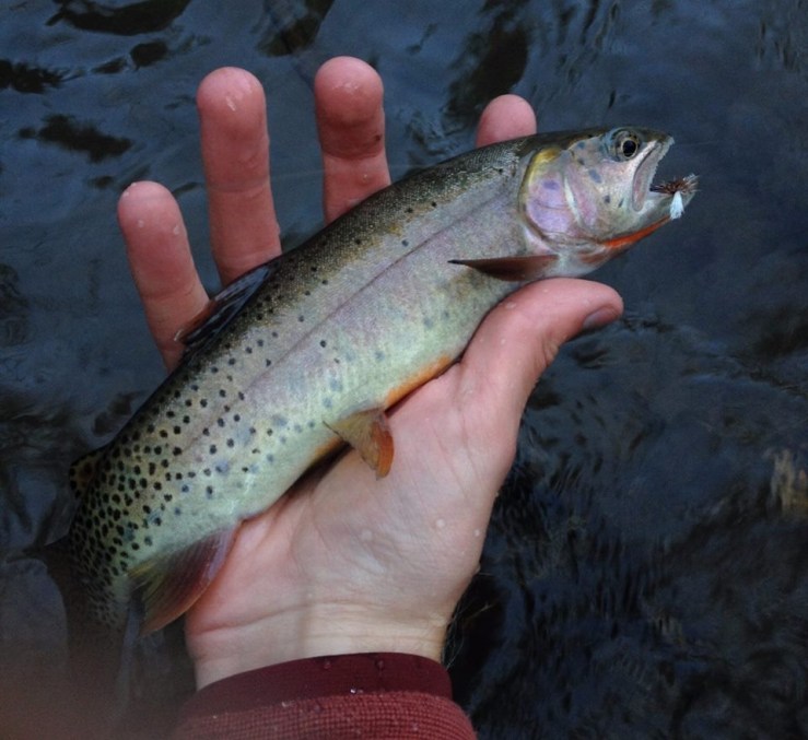 A stream flowed within earshot of our tents; a small feeder tributary of the Logan River. I hadn’t packed any food for myself and optimistically planned on eating trout. After setting up camp, I got the fly rod out and went to business. I knew prior to the trip that the Logan River is home to Bear River cutthroats, brown and rainbow trout, but was discouraged when I read an old DNR report that this particular tributary was “Brown trout dominant”. So I didn’t get my hopes up for catching this specie of cutthroat here.