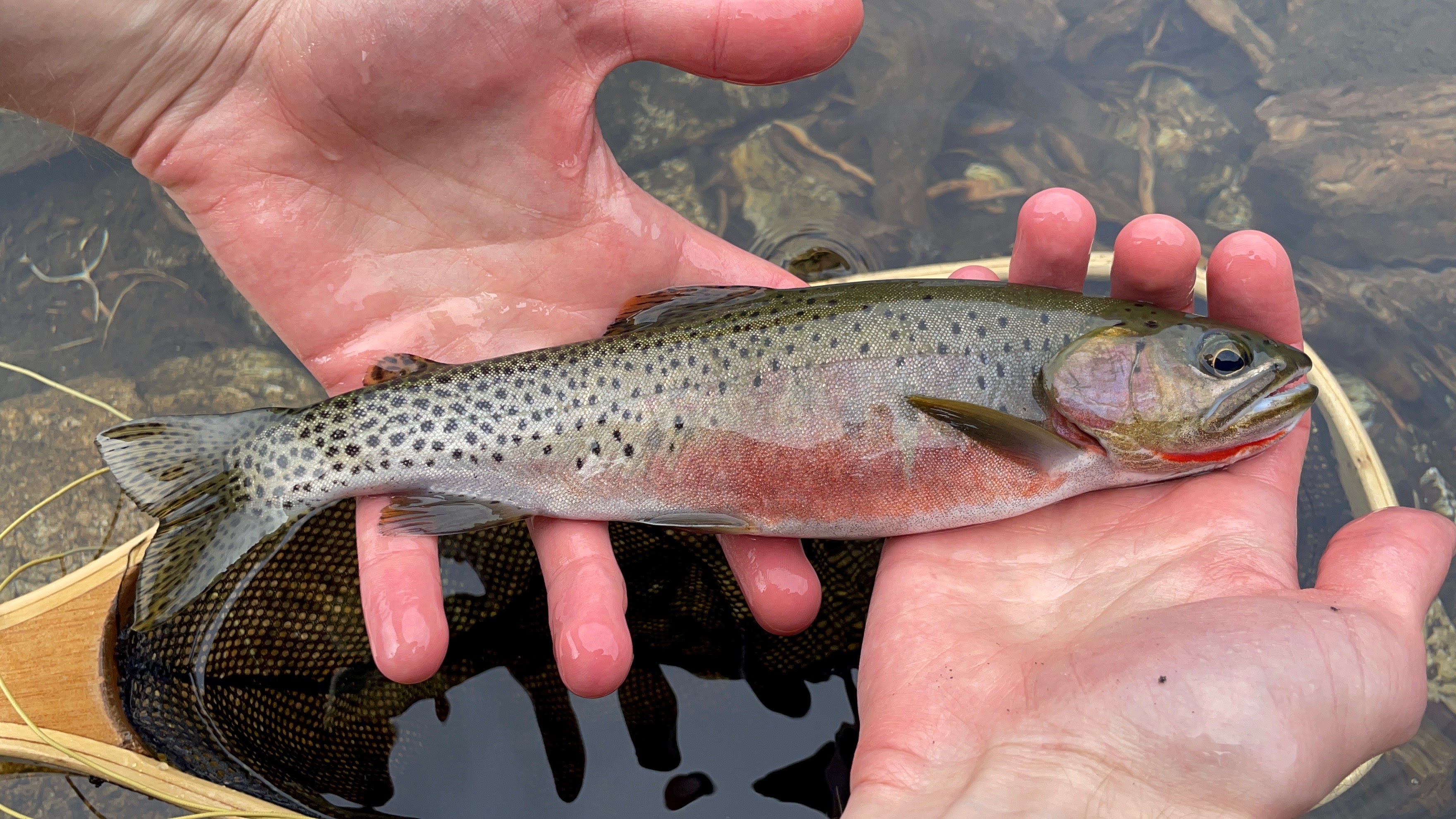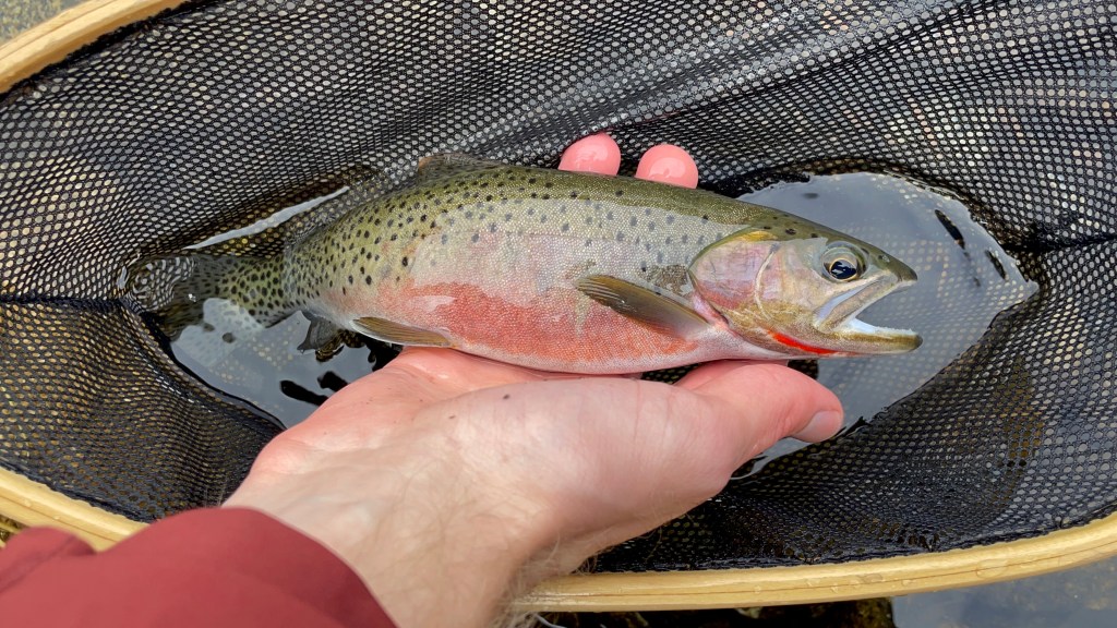 After finishing lunch, I tied on a golden stonefly imitation and launched casts towards the surface breaks. This took some getting used to as most of the streams I fish don’t require long casts and proved difficult with the steep boulder field behind me. Shortly after, the strikes started to follow and soon I was tied into my first trout of the trip. I could see flashes of bright red through the crystal clear water as it came closer. My anticipation grew that this could indeed be a westslope! My hunch was confirmed as it met my net and I was ecstatic at the prospect of a new trout species. I observed its magnificent coloration as it laid submerged in the net.