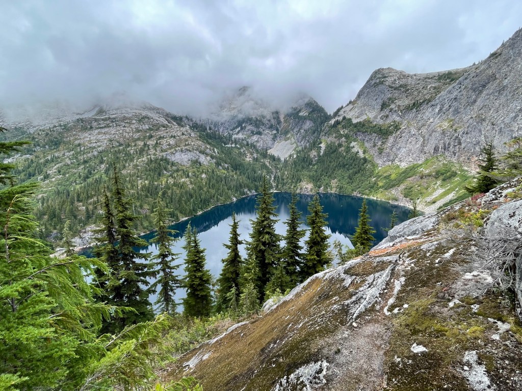 Shortly after the trail forked, we were soon at our highest vantage point and at last overlooking the destination in all of its glory. We took in these sights before making the steep traverse down to the water. Eventually we did make it to the bottom and enjoyed a nice lunch of tuna, crackers, and dried mango slices at the water’s edge while trout picked flies off the lake’s surface – a favorite sight of mine.