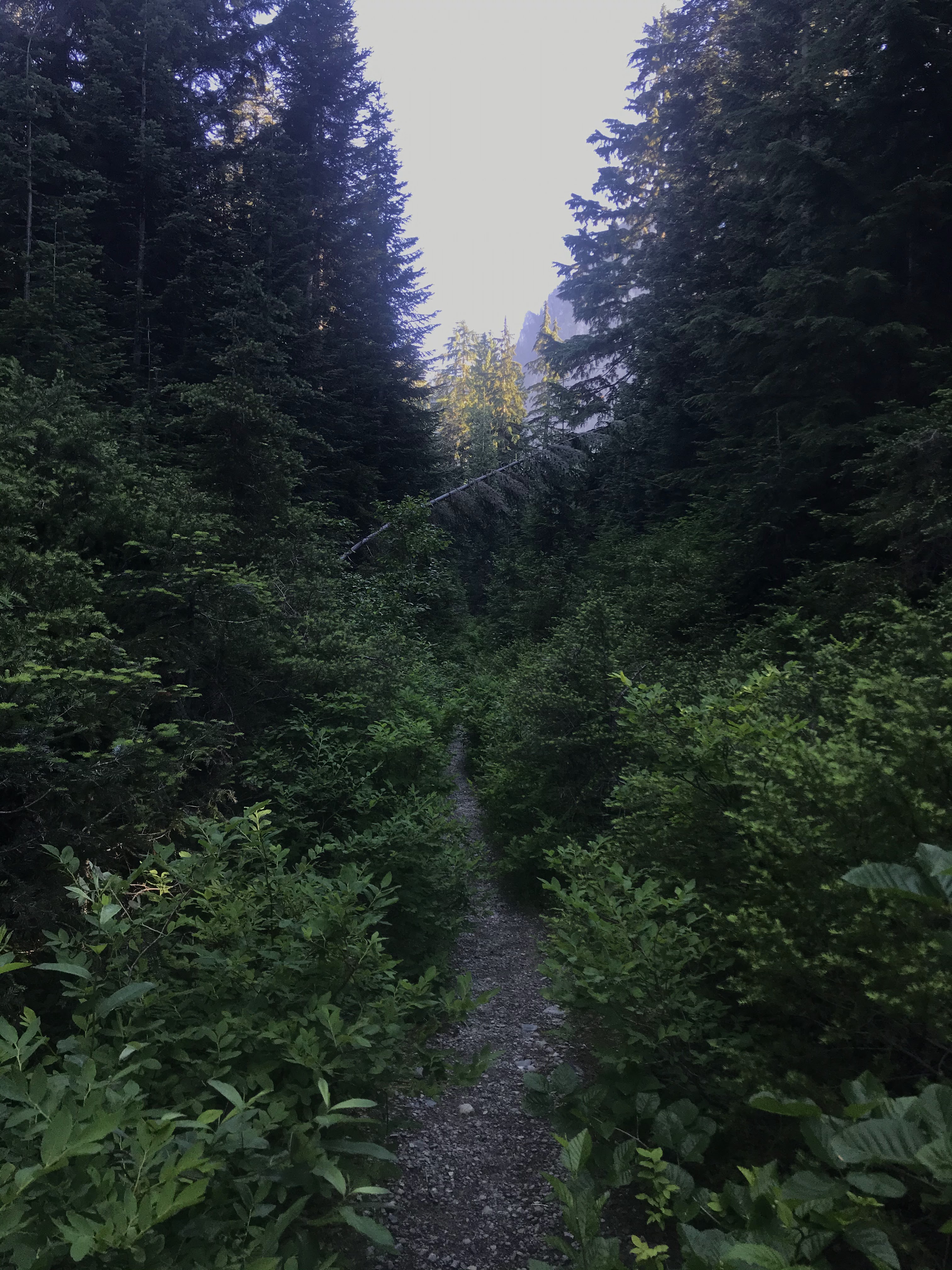 Staring down the start of the trail head-on, I knew that this wasn’t going to be easy. The brush was heavily overgrown on both sides leaving only a narrow corridor for passage. It was unavoidable but to make contact with the brush on both sides as I moved forward, and the tall, dense vegetation ahead gave me little visibility to potential animals (namely bears). To be honest, it was quite scary! Feeling my heart starting to beat faster, I stopped and asked myself aloud “what are you afraid of Sam, Bigfoot?” Ironically, this trick worked as the idea of a Sasquatch tumbling out from the brush seemed as hilarious as it did preposterous; my fears were immediately put to rest. Determined to reach my destination, I trudged onwards.